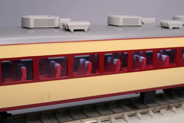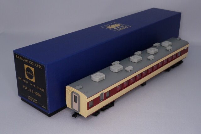 車体はエッチング・プレス製、前面はロストワックス製で、台車はTR69(クハ・サロ)・DT32(モハ)を使用し、共にダイキャスト製です。パンタグラフはモデルスイモン製PS16J(グレー)、キャブインテリア・客室内インテリアを装備、室内灯はチップ型白色LED仕様、前照灯・尾灯・ヘッドサインもLED仕様です。動力は、モハ183形式にキャノンEN22一般モーターとACEギアシステム(2600PB-軸距26.0㎜ φ10.5プレート黒メッキ車輪)を搭載しています。
