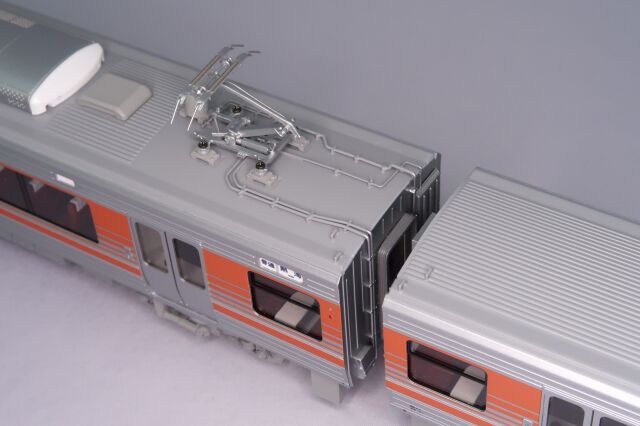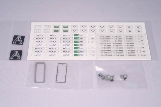 車体はエッチング・プレス製、前面はロストワックス製です。台車は全車ともヨーダンパーを装着したTR235(ダイキャスト製)を使用しています。パンタグラフはC-PS27(銀)、キャブインテリア・客室内インテリアを装備、室内灯はチップ型白色LED仕様、前照灯・尾灯・前面行先幕もLED仕様です。動力は、中間車のモハ313-8500にキャノンEN22一般モーターとACEギアシステム(2600WG-軸距26.0㎜ φ10.5波打ちグレー車輪)を搭載しています。