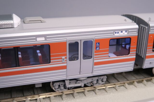 本製品は、令和4(2022)年3月に神領車両区から静岡車両区へ移動し、静岡地区の東海道線を中心に活躍中の「8000番台 S編成」をプロトタイプとして模型化しました。車体側面の上下に細い白が入るオレンジ帯や窓周りのデザインは印刷処理によって乱れなく忠実に再現しています。