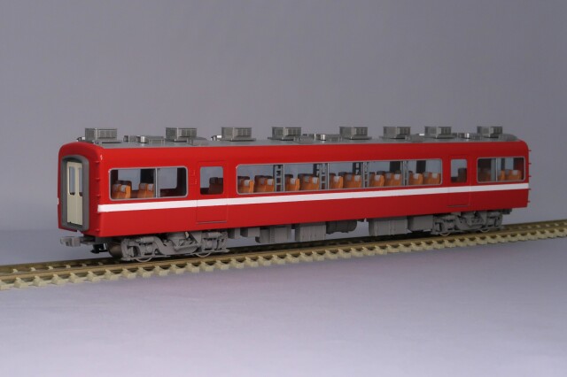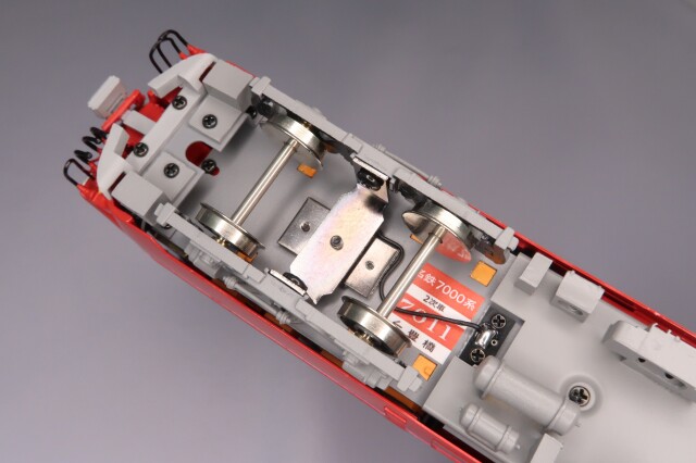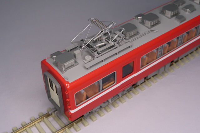 車体はエッチング・プレス、前頭部と妻板はロストワックス製です。台車はFS335、パンタグラフはPT43E(銀)、室内にはキャブインテリア・客室内インテリアを装備、室内灯はチップ型白色LED仕様、前照灯・尾灯・前面行先種別表示器もLED仕様です。動力は、中間車「モ7162」にキャノンEN22軸短モーターとACEギアシステム(2600WG-軸距26.0㎜ φ10.5波打グレー車輪)を搭載しています。