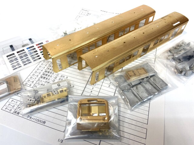 車体と前面はエッチング・プレス製です。台車はTS807を流用、パンタグラフはPT48(銀)、室内にはキャブインテリア・客室内インテリアを装備、室内灯はチップ型白色LED仕様、前照灯・尾灯・前面行先方向幕もLED仕様です(※標識灯は点灯しません)。動力は、クモハ1000にキャノンEN22軸短モーターとACEギアシステム(2750P-軸距27.5mm φ10.5プレート車輪)を搭載しています。