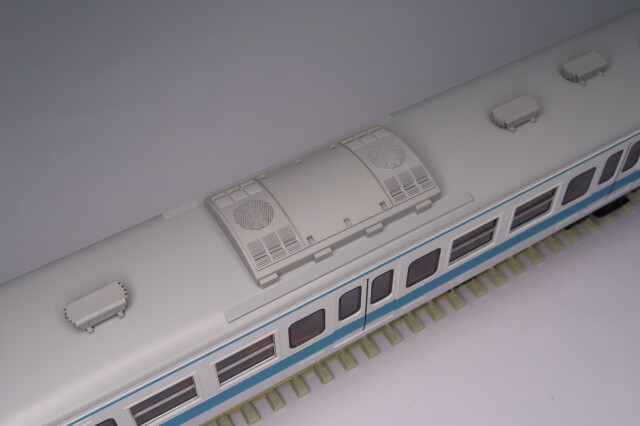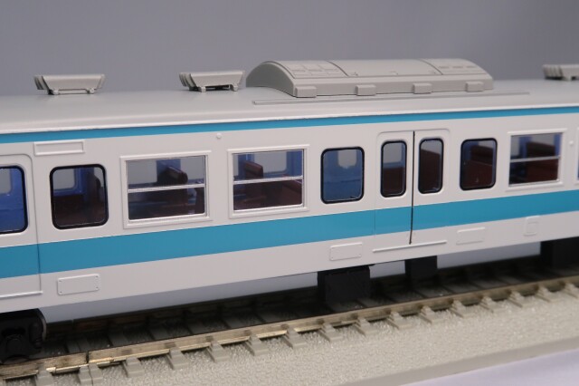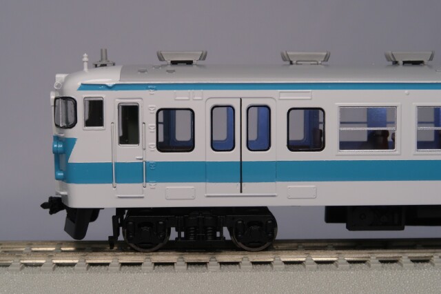 車体はエッチング・プレス製、前面はロストワックス製で、ドア窓と戸袋窓はHゴム表現も施したプラスチック成型品を使用しました。台車はTR212(クハ)・DT21(モハ)を使用し、共にダイキャスト製です。パンタグラフはPS16グレー、キャブインテリア・客室内インテリアを装備、室内灯はチップ型白色LED仕様、前照灯・尾灯・前面行先幕もLED仕様です。動力は、モハ112-7000にキャノンEN22一般モーターとACEギアシステム(2600PB-軸距26.0㎜ φ10.5プレート黒メッキ車輪)を搭載しています。