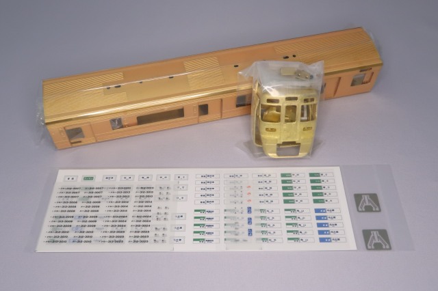 車体はエッチング・プレス製、前面はロストワックス製です。台車は全車ともヨーダンパーを装着したTR235(ダイキャスト製)を使用しています。パンタグラフはC-PS27(銀)、キャブインテリア・客室内インテリアを装備、室内灯はチップ型白色LED仕様、前照灯・尾灯・前面行先幕もLED仕様です。動力は、クモハ313-3000にキャノンEN22一般モーターとACEギアシステム(2600WG-軸距26.0㎜ φ10.5波打ちグレー車輪)を搭載しています。