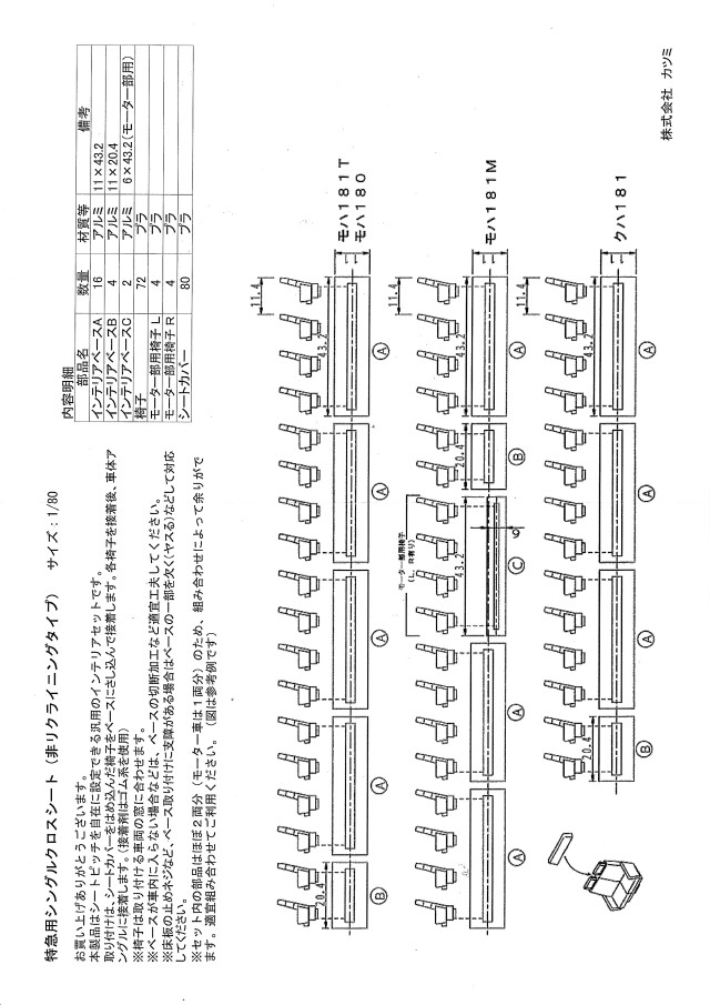 ベース(アルミ)は3種類{A(11×43.2)…16枚、B(11×20.4)…4枚、C(6×43.2:モーター部用)…2枚}・椅子(プラ)…72個・単シート(プラ)…24個(モーター部用)・シートカバー(プラ)…72個のセットになります。(カツミ製品)