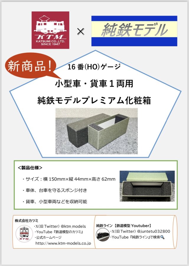 【嬉しいお知らせ】この度、株式会社カツミ様と純鉄モデルプレミアム化粧箱がコラボすることになりました!貨車、小型車両用の収納ケースになります!お値段は直営店限定税込1,650円です。9月下旬から発売予定です!みなさまよろしくお願いします♪ pic.twitter.com/fsROyNVRTf— 純鉄モデル (@juntetumodel) September 14, 2024